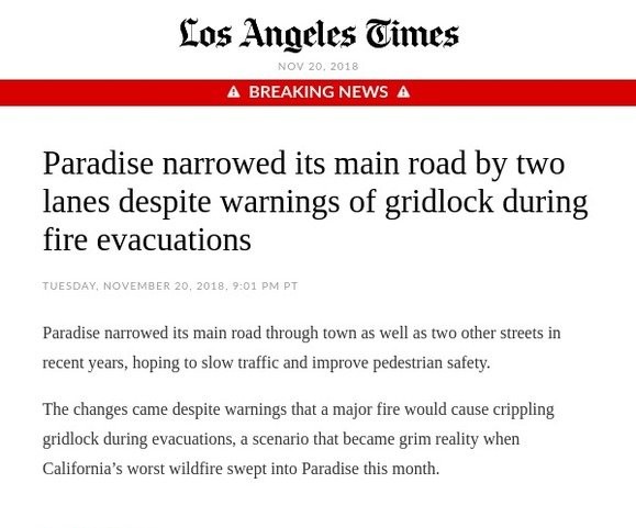 The main road in Paradise was narrowed from 4 lanes to 2 lanes in 2015, as part of the restructuring the city for “Sustainable development”. This caused a gridlock as people were trying to escape the fires and they were burned alive in their cars.