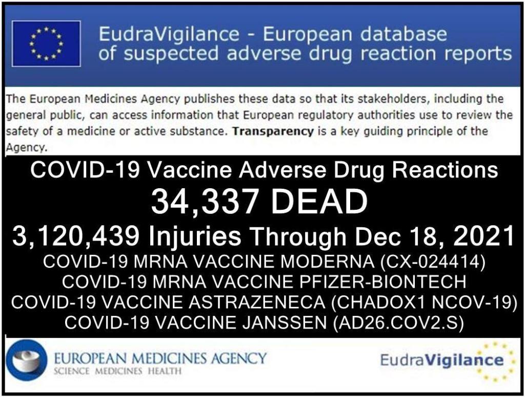 In the European Union, as of December 18th 2021, Covid vaccine deaths were at 34,337 and 3.12 Million adverse reactions: