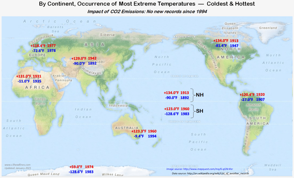 No hot temperature records have been broken in the world since 1977 and most were set earlier during the 20th Century. This is consistent with actual, measured temperatures, shown on the previous charts.