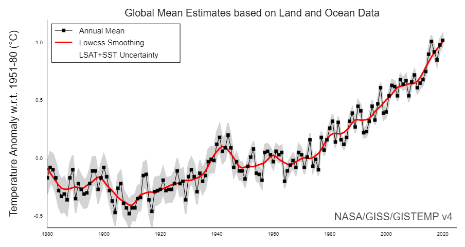 Global temperatures 1880 – 2020. This is the most often referenced chart in the world, (same in the feature image), depicting a sharp increase in global temperature over 140 years. It was “adjusted” to show a runaway trend, to support the “climate emergency” claim.