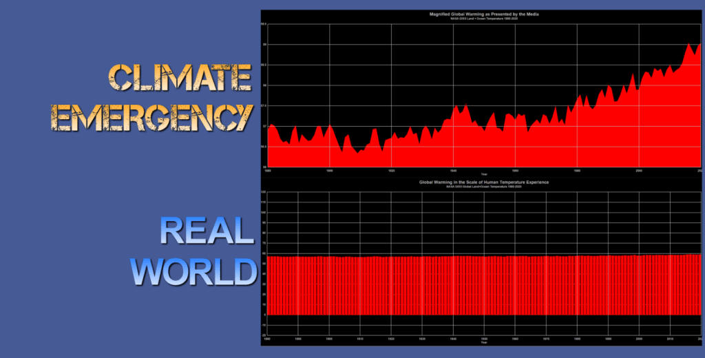 The top graph is magnified to a small temperature range, that is reported by the media. The bottom is the same data, presented in an absolute temperature. The bottom graph does show a miniscule increase – the reader may need a magnifying glass, or a microscope to see it – that’s the “existential threat”, we are facing.