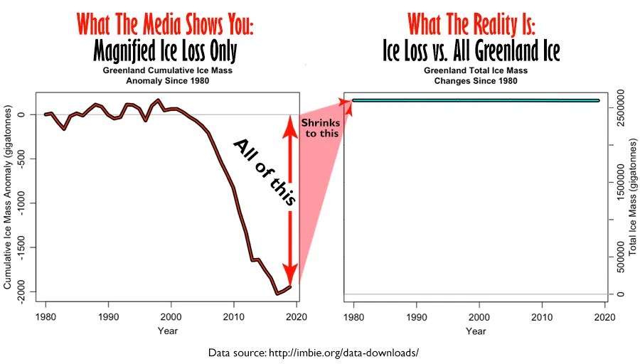 The same trick is used to report the melting of the ice caps. The left graph is shown to the public, suggesting significant ice loss, the right is the actual change.