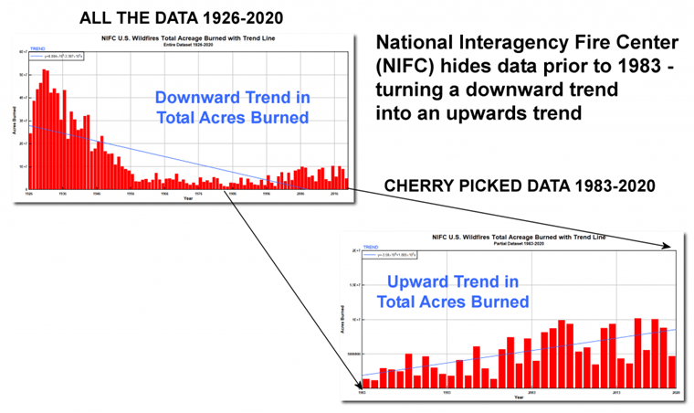 Cherry picking the data is also common. The graph on the left shows that wildfires declined greatly since 1926. The graph seen by the public, starts at the lowest point, to show an increase in fires.