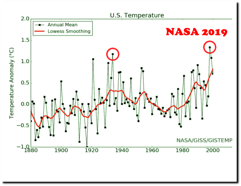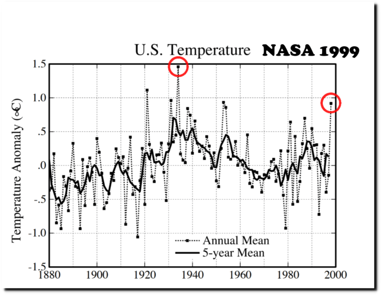 Yet another way data has been manipulated is by altering graphs to exaggerate the present warming trend. Below is US temperatures from 1880 to 2000, by NASA 1999. The 1930s were the hottest.