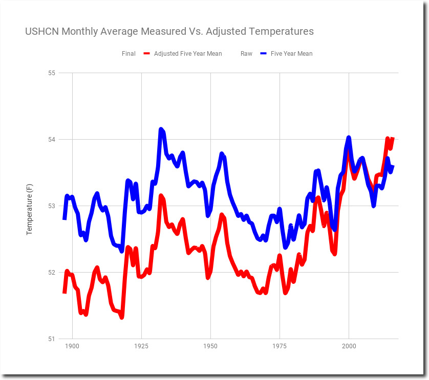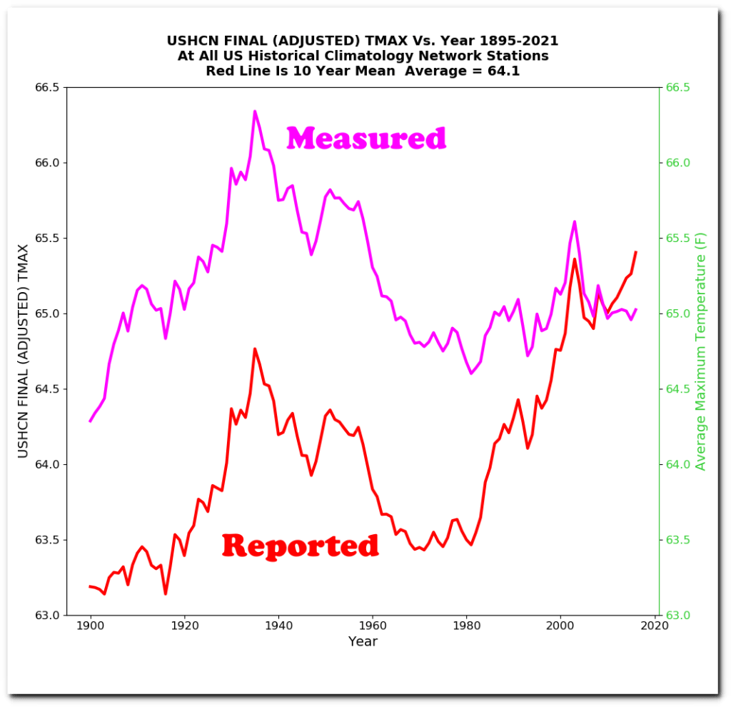 Here are both on one chart. The reported temperature depicts a sharp increase at the end, to make the present time appear the hottest. The actual, measured temperature correctly shows 1930s as the hottest.