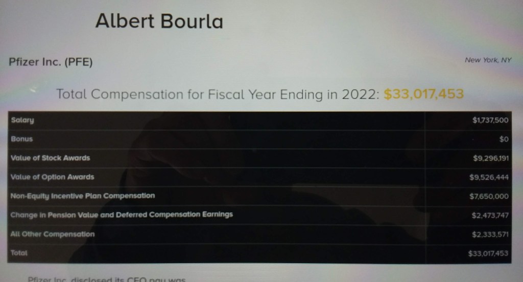 At the same time pharmaceutical companies posted record profits. Pfizer revenue exceeded $100 Billion for 2022. Total compensation for its CEO, Andrew Bourla was $33 Million for 2022. (Source)